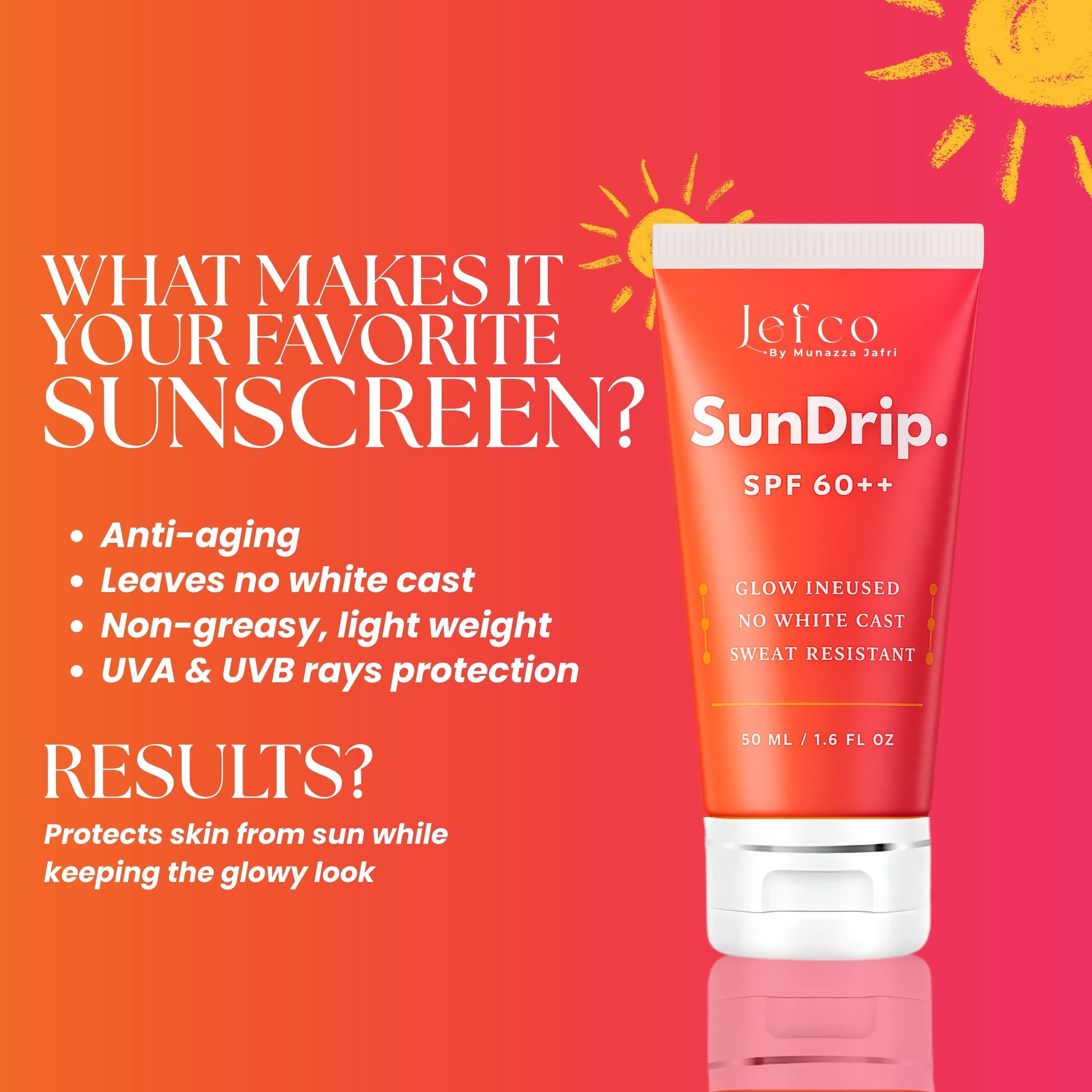 Introducing Jefco SunDrip SPF 60++, the ultimate sunscreen designed for everyday wear. Packed with advanced sun protection and skincare benefits, SunDrip shields your skin from harmful UVA & UVB rays while leaving behind a natural, radiant glow.